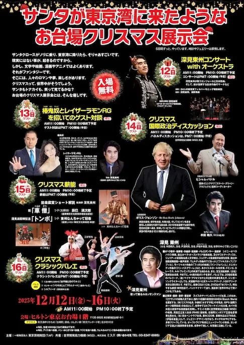 ということで今年も深見東州さんは、歌に狂言、バレエ、トークショーや政治談義と、5日間、毎日違うイベントにすべて出演しますね。共演するゲストの面々もすごい方なので、今年も見応えがある楽しいクリスマスイベントになるでしょう。